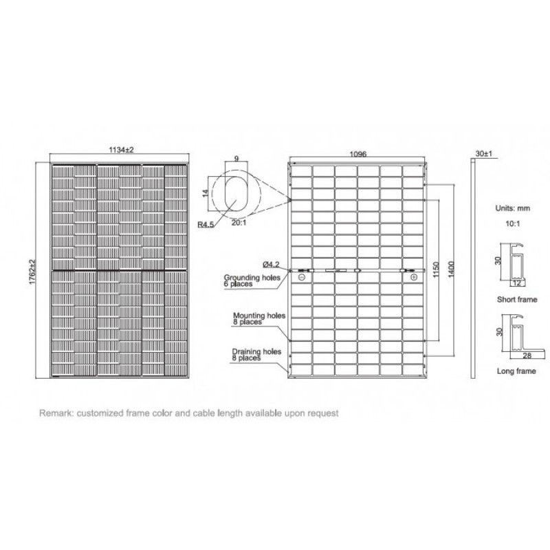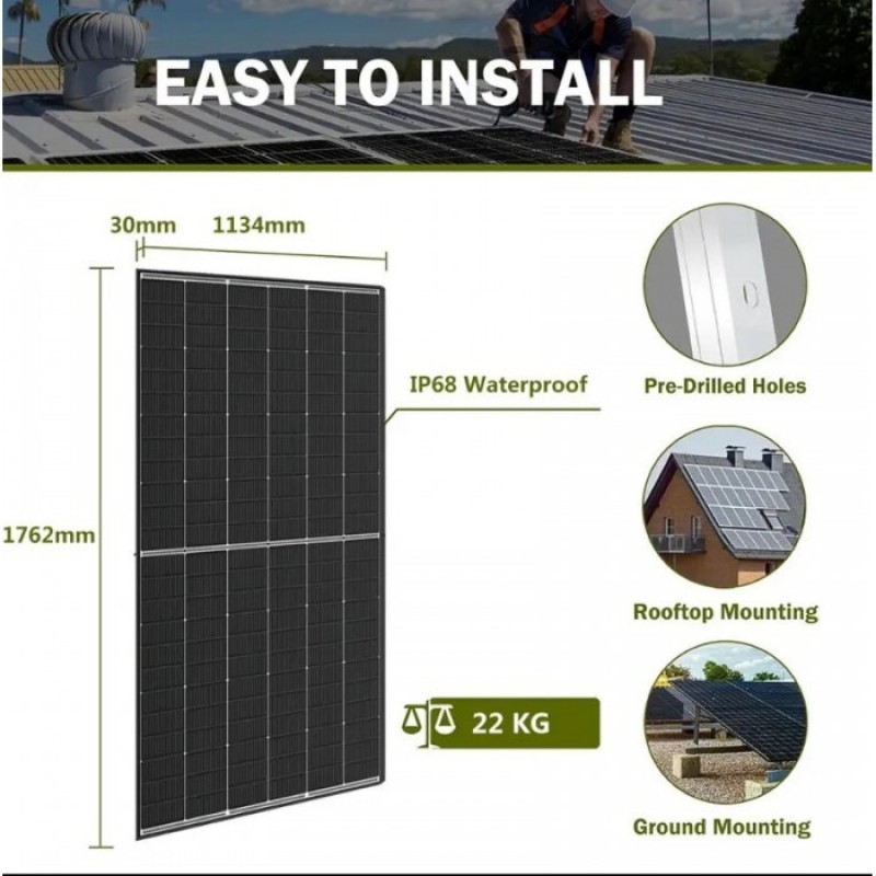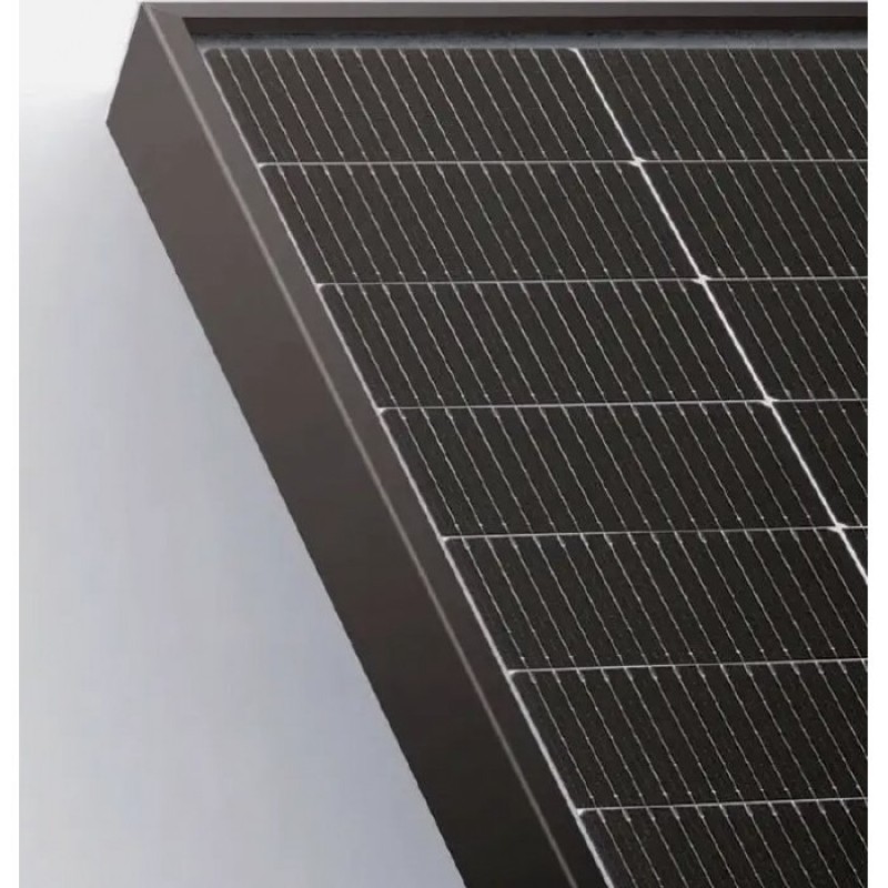 - Надійна конструкція: виконання у форматі «скло-скло» забезпечує високу механічну міцність і стійкість до впливу навколишнього середовища. Панель підтримується 25-річною гарантією на продукт і продуктивність. Чорна рама не лише підсилює захист від атмосферних факторів, а й надає модулю сучасного вигляду, що ідеально підходить для стильних інсталяцій.