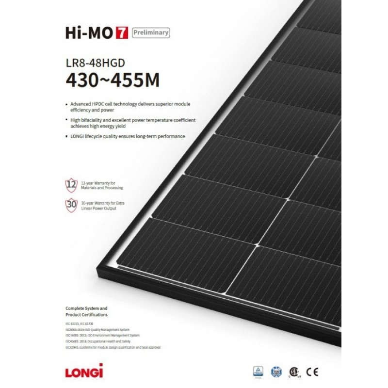 Hi-MO 7 — це новітнє покоління високоефективних модулів LONGi, створене для ринку комунальних послуг. Модуль виготовляється за технологією SMBB, і включає два типи продуктів: LR5 72HGD (2278 мм × 1134 мм) та LR7 72HGD (2382 мм × 1134 мм).